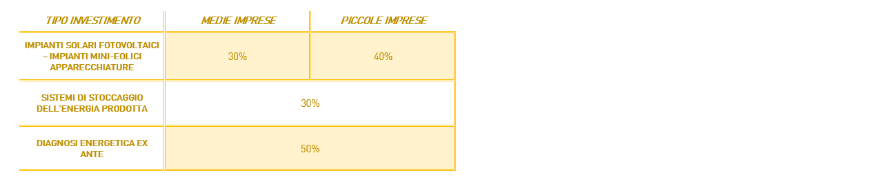 Finanziamento a fondo perduto, variabile dal 30% al 50% secondo le seguenti specifiche: