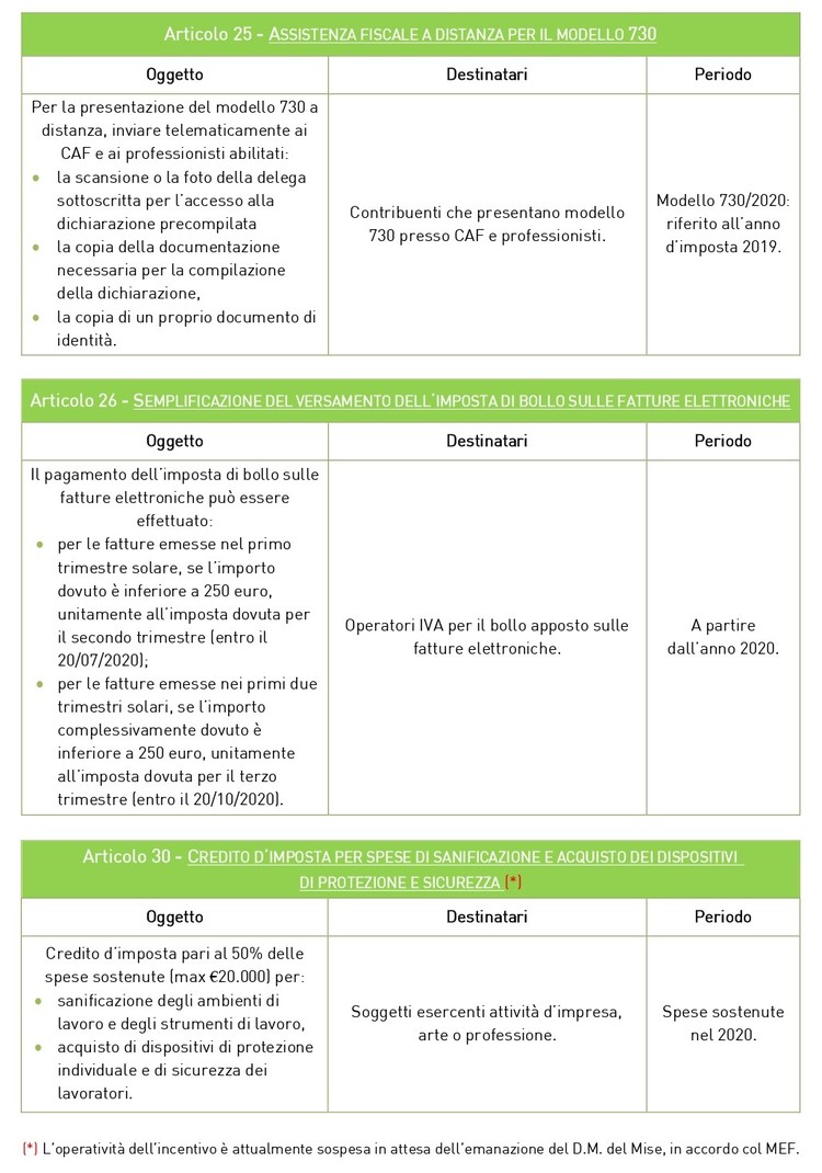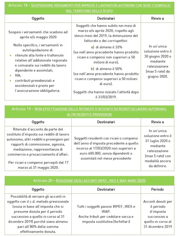 Di seguito una tabella riepilogativa delle MISURE FISCALI E CONTABILI, ritenute maggiormente d’interesse, presenti al CAPO IV del Decreto Liquidità.