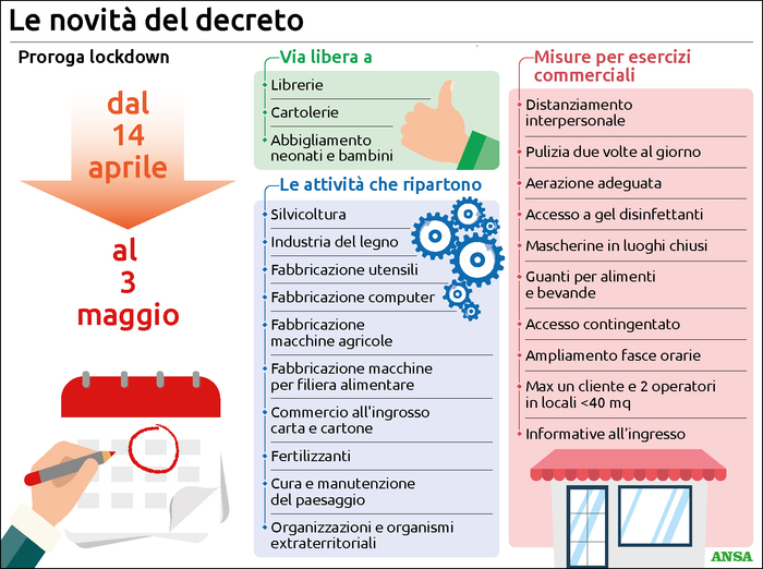 Con il nuovo Dpcm, a partire dal 14 aprile, riaprono un numero ristretto di negozi e attività, tra cui le librerie, le cartolerie e i negozi di vestiti per neonati e bambini. Ripartono anche alcune attività, tra cui le attività forestali, l’industria del legno e la produzione di computer. Ancora più ferrea sarà la stretta sui rientri dall’estero e sui viaggi di lavoro nel nostro Paese, con controlli agli imbarchi e nuove regole operative (legate al protocollo condiviso sulla sicurezza sui luoghi di lavoro) sono introdotte per gli esercizi commerciali.