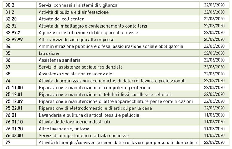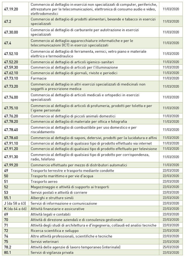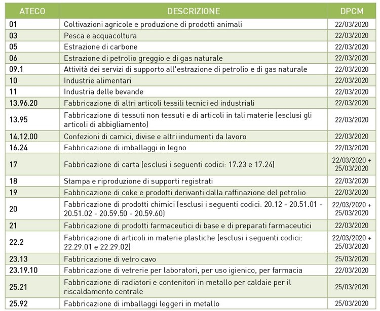 Ricapitoliamo ora nella TABELLA “A” i codici ATECO delle attività consentite: