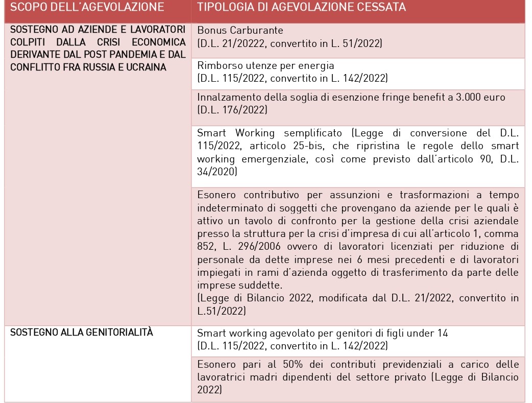 Alcune agevolazioni introdotte a sostegno di aziende e lavoratori colpiti dalla crisi economica derivante dal post pandemia e dal conflitto fra Russia e Ucraina non hanno trovato conferma nelle disposizioni per l’anno 2023, così come le misure atte a sostenere le neomamme lavoratrici, a favore di misure agevolative per entrambi i genitori in ottica di parità di genere.