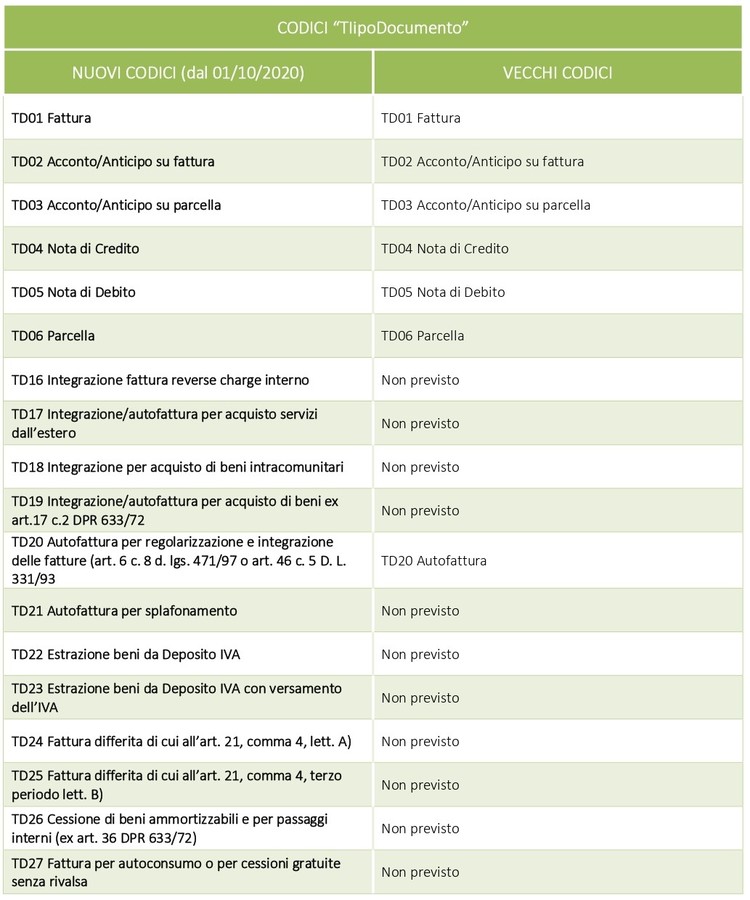 Vengono aggiunti nuovi codici con riferimento alle autofatture, quindi non sarà più possibile indicare solamente il codice generico “TD20 Autofattura”. Vengono anche introdotti due codici, il “TD17” e il “TD18” che servono per creare il documento in xml di integrazione dell'acquisto di servizi esteri e di beni intracomunitari. Tali documenti però, allo stato attuale, non devono essere necessariamente inviati al Servizio di Interscambio, ma potranno essere comunque oggetto di invio su scelta del contribuente che in questo modo dovrebbe anche poter evitare la compilazione del così detto “esterometro”.
