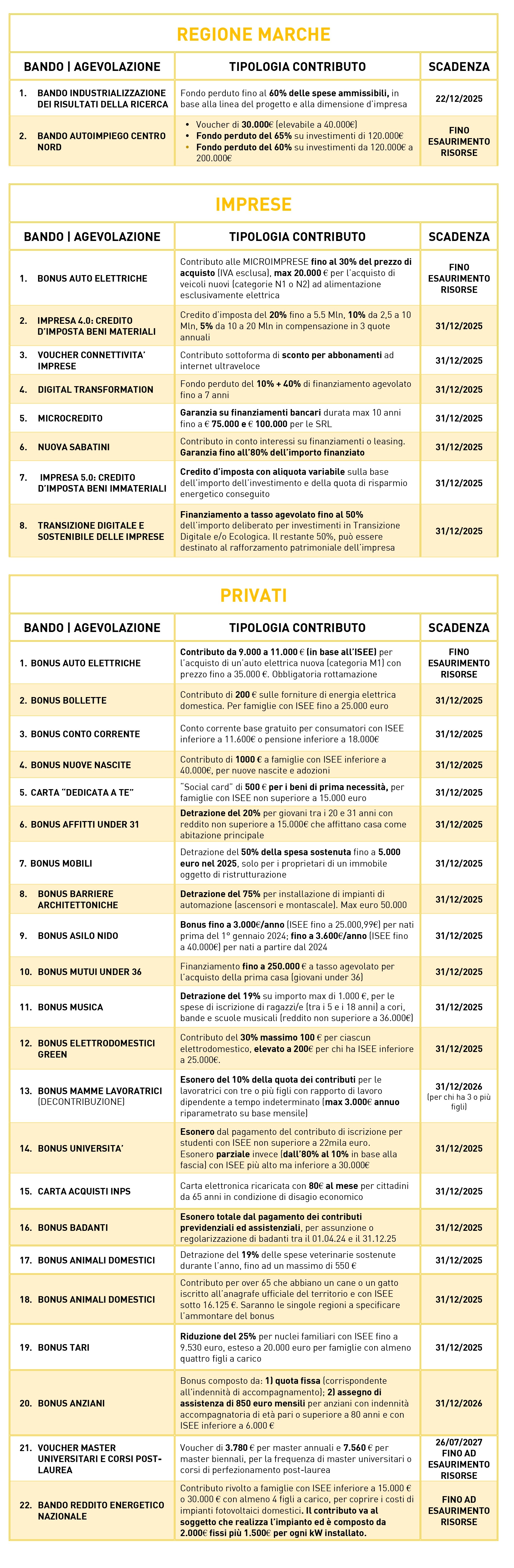 Elenco dettagliato di tutte le possibilità attive di bandi, agevolazioni, incentivi regionali e statali aggiornato al 26/11/2025