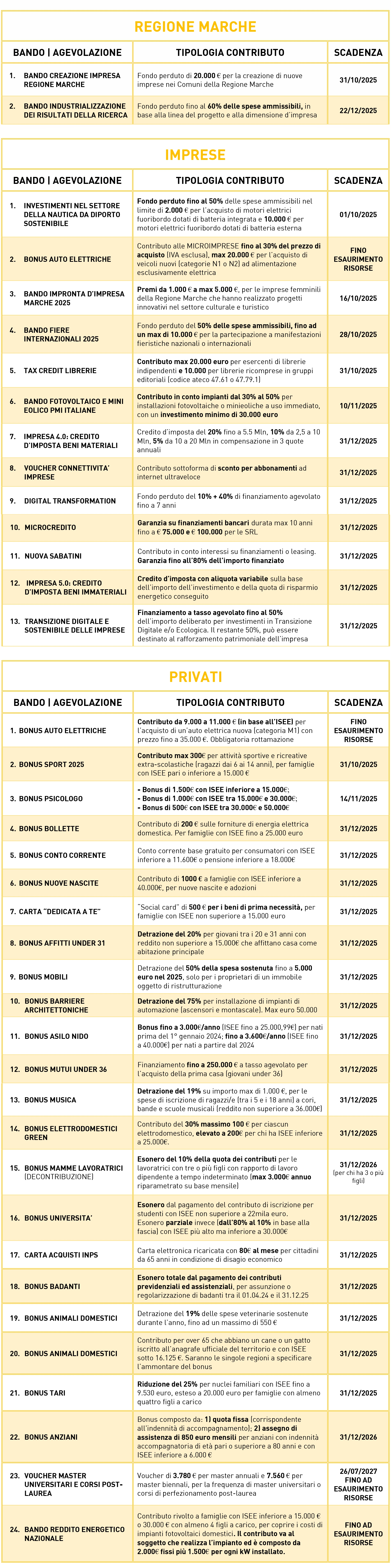 Elenco dettagliato di tutte le possibilità attive di bandi, agevolazioni, incentivi regionali e statali aggiornato al 23/09/2025